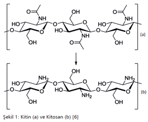 Kitosan ise kitinin alkali ortamda deasetilasyonu (Şekil 1) sonucu elde edilen (1-4) bağlı D-glukozamin ünitelerinden oluşmaktadır. Ortalama molekül ağırlığı 3.200-2.000.000 g/mol arasındadır. Kitinin aksine kitosan sulu asidik ortamlarda çözünür. Kitosan C-2 pozisyonunda bulunan –NH2 gruplarının protonlanması sonucu çözünür ve böylelikle asidik ortamlarda polielektrolite dönüşür. Kitin ve kitosanın yapısında bulunan azot miktarı (%6,89) sentetik substitüsyonla selülozdan elde edilenden (%1,25) daha fazladır. Azot içeriğinin zengin olması kitin ve kitosanı şelat oluşturma ajanı olarak değerli hale getirir [7].