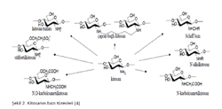 Kitosan Türevleri: Kitosanın sahip olduğu çoklu nükleofilik yapısı özellikle sentez çalışan organik kimyacıların dikkatini çekmiştir. Kitosan primer amin grubunun ve primer ve sekonder hidroksil gruplarının reaktivitesi nedeniyle kolayca türevlendirilebilmektedir. N-alkil kitosan, N-karboksi alkil (aril) kitosan, N-karboksiasil kitosan, O-karboksialkil kitosan, şeker türevleri ve metal iyon şelatları kitosan türevlerinden bazılarıdır (Şekil 2).