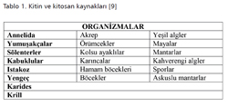 Kitin doğada genellikle, deniz yosunları, tek hücreliler (kamçılılar, amip kirpikliler vs.), selentereler, yumuşakçalar, eklembacaklılar, bakteriler, mantarlar, böcekler ve bazı bitkilerde bulunur (Tablo 1). En zengin kitin kaynakları ise; yengeç, karides, ıstakoz ve kerevit (tatlısu ıstakozu) kabuklarıdır.