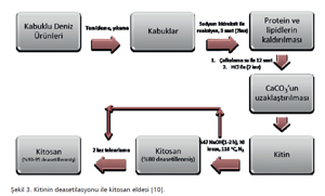 Kabuklu deniz canlılarının yenebilir kısımları ayrıldıktan sonra kalan bu atık miktarının sadece % 20’ye yakın bir kısmı değerlendirilebilmekte ve ürün olarak sunulabilmektedir. Denizcilik sektöründe bu kaynaklara ait atıklar yıllık 1,2 milyon tondan fazladır. Bilinen kitosan üretim prosesi, atık kabuklardan kitinin uzaklaştırılması ve kitinden kitosan üretimi şeklindedir [4]. Kitosan üretimine ait proses akış şeması Şekil 3’te gösterilmiştir.