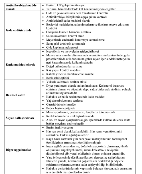 Günümüzde Kitin, selülozdan sonra dünyada en yaygın olarak bulunan ikinci en önemli biyopolimerdir. Yengeç, karides gibi kabuklu su ürünlerinin ana bileşeni olup böceklerin iskeletinde ve mantarların hücre duvarlarının yapısında bulunmaktadır. Kitinin birçok türevi bulunmakla beraber, bunlar arasında en önemlisi kitosandır. Kitosan polimeri kitinin kısmi deasetilasyonu ile elde edilen bir polisakkarittir. Kitosan hemostatik, bakteriyostatik, fungistatik, antikanserojen, antikolesteremik, antiasid, antiülser, yara ve kemik iyileşmesini hızlandırıcı, bağışıklık sistemi stimülanı gibi önemli biyoaktif özelliklere sahiptir. Bu özelliklerinin yanı sıra film oluşturabilme ve bariyer özellikleri kitosanı antimikrobiyal özellikte yenilebilir film ve kaplamalar için ideal bir materyal haline getirmektedir. Özellikle sebze ve meyvelerin kalitelerinin korunması ve depolama sürelerinin artırılmasında kitosanın kullanım potansiyeli ortaya konulmuştur. Gıdaların kitosan film ile kaplanması ambalaj içindeki kısmi oksijen basıncını azaltmakta, gıda ile çevresi arasındaki nem transferi ile sıcaklığı kontrol altında tutmakta; su kaybını azaltmakta, meyvelerde enzimatik kahverengileşmeyi geciktirmekte ve solunumu kontrol etmektedir. Bunlara ilave olarak doğal aromanın arttırılması, tekstürün ayarlanması, emülsifiye edici etkinin arttırılması, rengin stabilizasyonu ve deasidifikasyon gibi konularda da kitosandan yararlanılmaktadır. Kitosanın uygulama alanları, eczacılık, medikal, atık su arıtma, biyoteknoloji, kozmetik, gıda, tekstil ve ziraat şeklinde sıralanmaktadır. Bu araştırmada, kitosanın özellikleri, kitosan üretimi ve kullanım alanları hakkında bilgi verilmesi amaçlanmıştır.