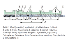 Stasiek [5], PP ekstrüzyonu için çift vidalı bir karışım ekstrüderini optimize etmiştir. Birçok tasarımı içeren çalışmada örneğin; 3 gaz alma ve 2 karıştırma segmenti olan modifiye edilmiş bir vida tasarımına sahip, gaz alma sistemli eş dönüşlü çift vidali bir ekstrüder sistemi geliştirilmiştir (Şekil 2). Mevcut eşdönüşlü ekstrüder tasarımları, yüksek kesme gerilmesinden dolayı, mevcut termoplastiğin yapısının değişmesine neden olabilmektedir. Bu da polimer degredasyonu anlamına gelmektedir. Plastizite bölgede doğan yüksek ısıl ve mekanik yüklemeler de bu durumun sebebidir [5].