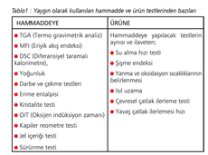 Tablo 1. Yaygın olarak kullanılan hammadde ve ürün testlerinden bazıları